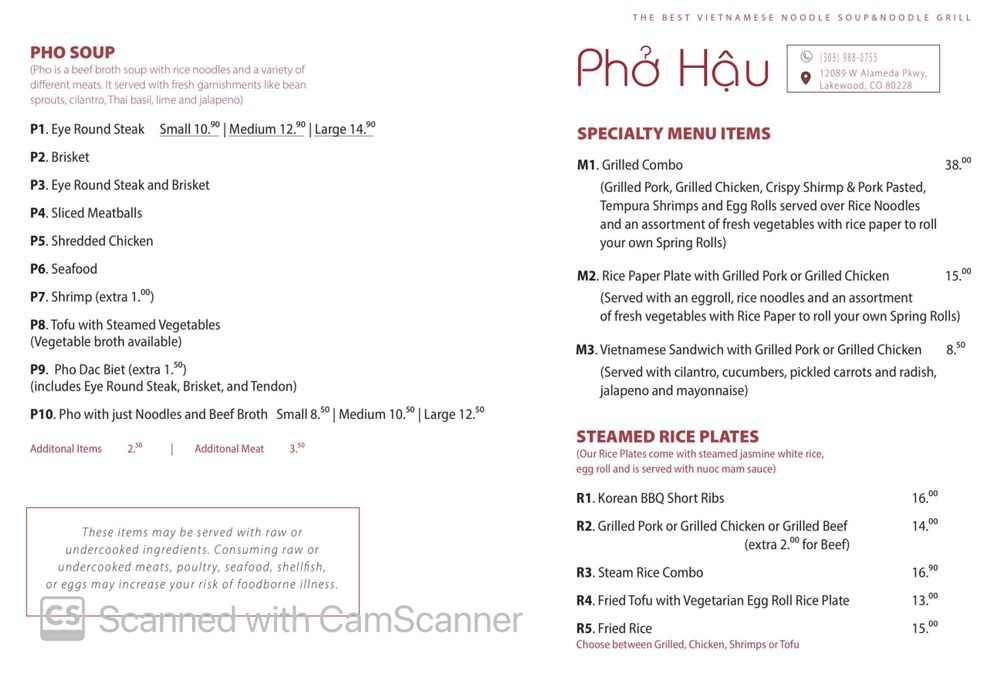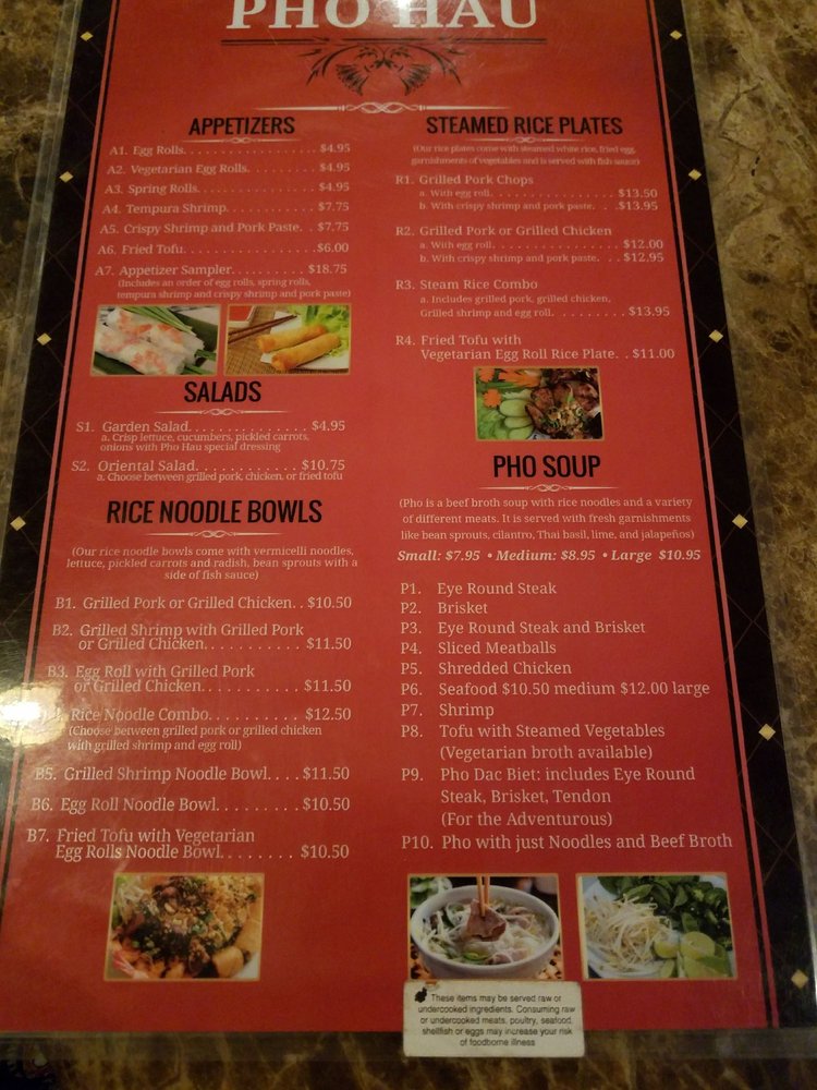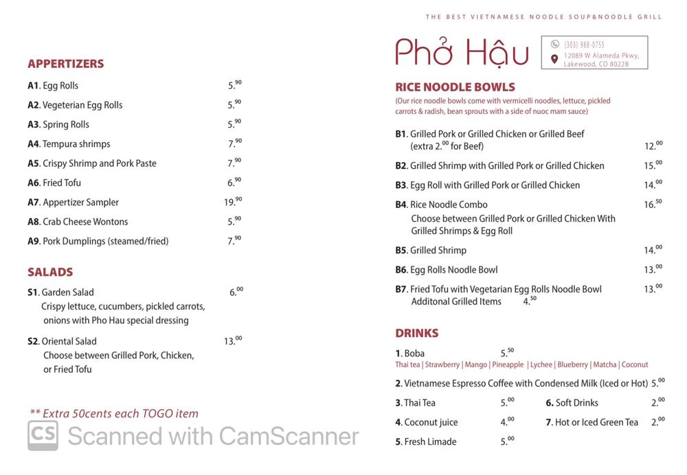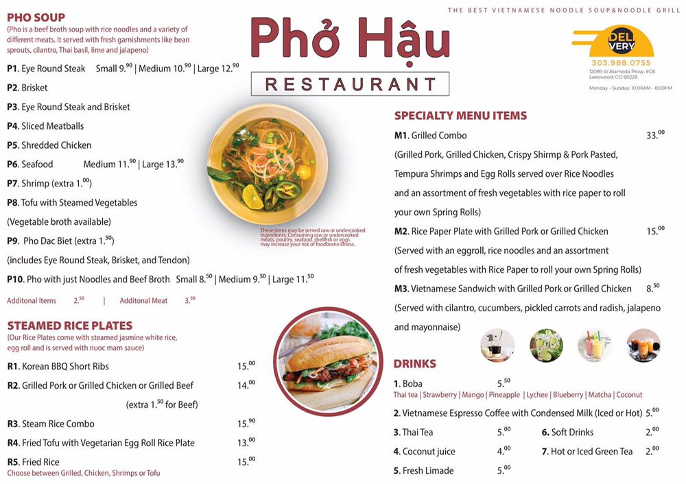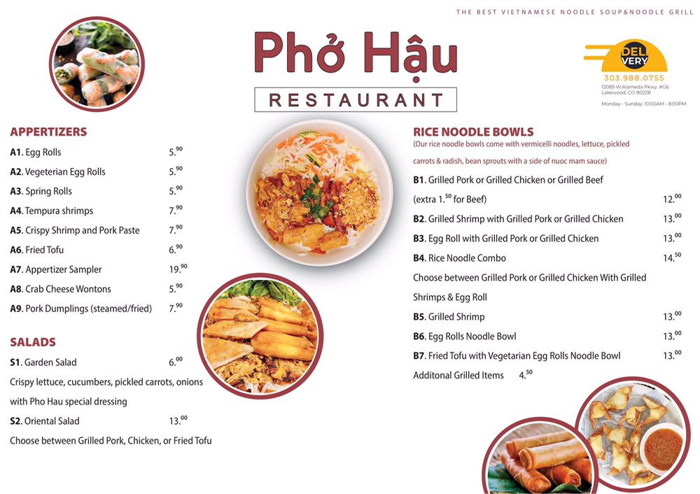 Pho Hau Restaurant in Lakewood, CO offers a diverse menu of Vietnamese cuisine. With options for takeout, reservations, and vegan-friendly dishes, this restaurant caters to a wide range of preferences. Their appetizers include a variety of spring rolls and flavorful starters, while their rice noodle bowls feature options like grilled pork, chicken, and shrimp. Customers highly praise the freshness and taste of the dishes, with remarks on the delicious pho broth and generous portions. The vibrant atmosphere and attentive service make dining at Pho Hau a pleasant experience. The Bahn Mi sandwiches, specifically the Pork Bahn Mi, are highlighted for their rich flavors and generous meat portions. Visiting this restaurant is recommended for anyone looking for authentic Vietnamese cuisine in a welcoming setting.